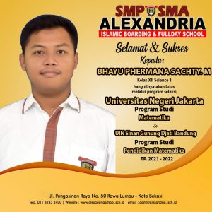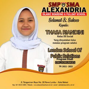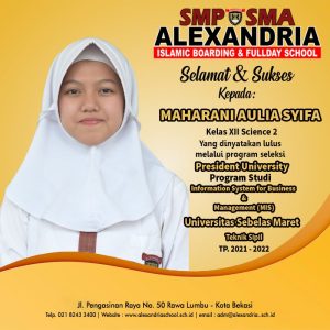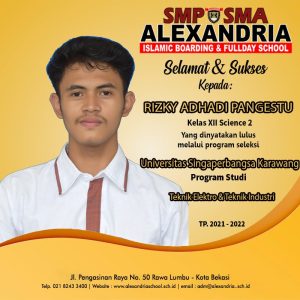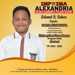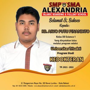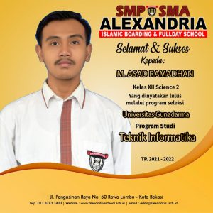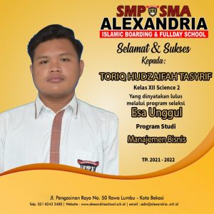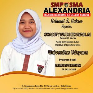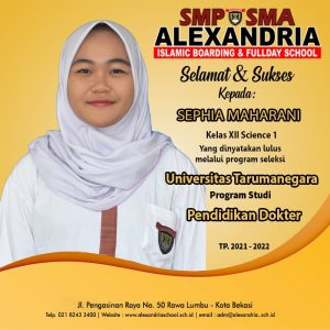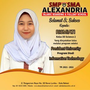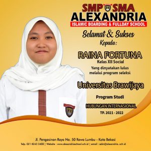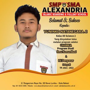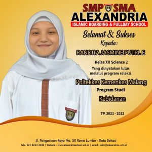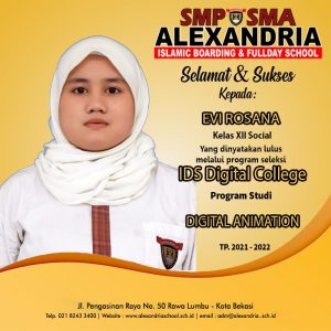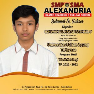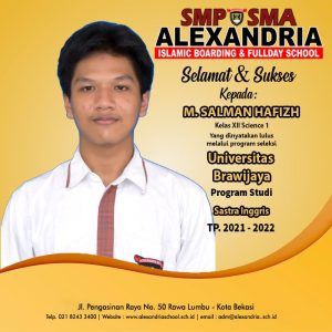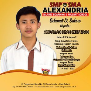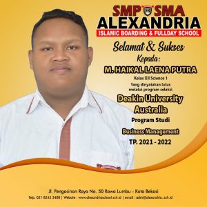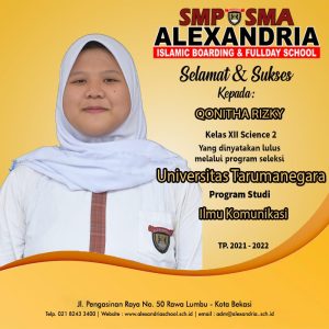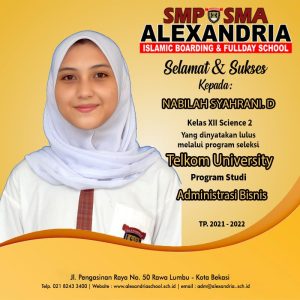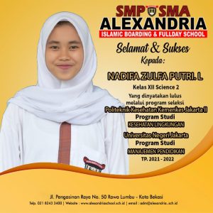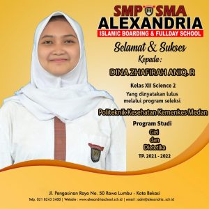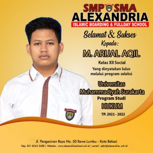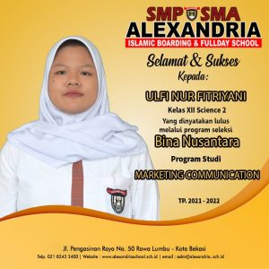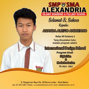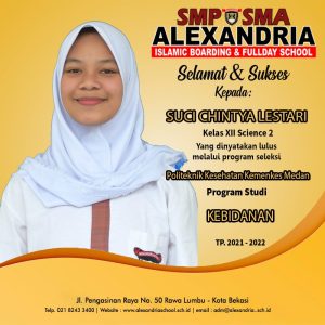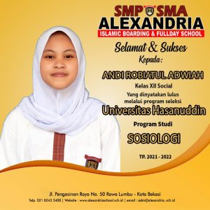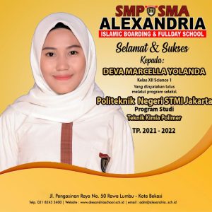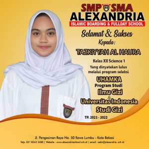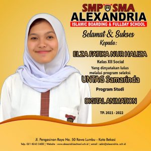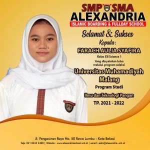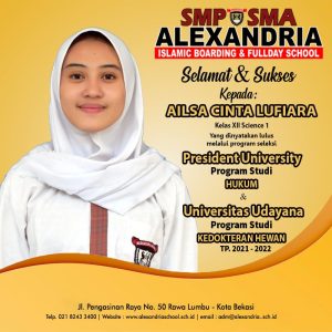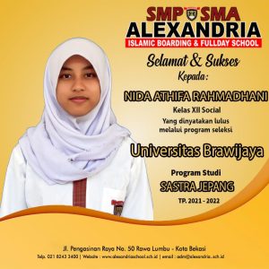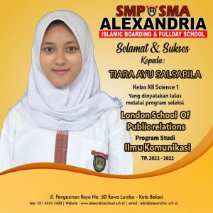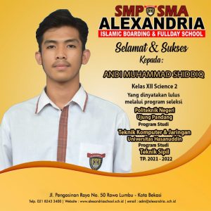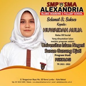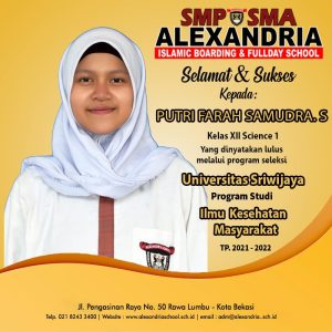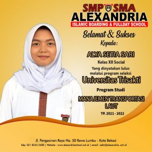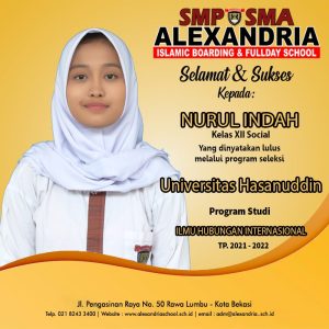 Assalamualaikum… Alhamdulillah, dengan izin Allah, Siswa Siswi Alexandria Islamic School berhasil Lulus Seleksi perguruan tinggi beberapa waktu lalu. Semoga dengan prestasi yang diraih oleh ananda, bisa menjadikan inspirasi bagi siswa lainnya, dan bermanfaat kelak bagi ananda dan serta lingkungannya.